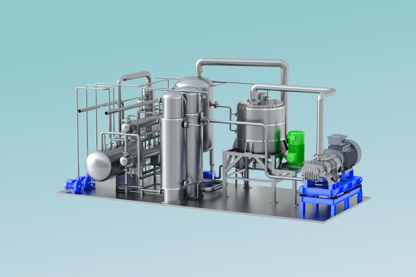 MVR熱泵精餾系統(tǒng)以高效旋轉(zhuǎn)精餾床為基礎(chǔ),利用離心力場代替重力場,強(qiáng)化相與相之間的相對速度和相互接觸,通過強(qiáng)化傳質(zhì)傳熱來提高分離效率縮小設(shè)備體積。 通過在系統(tǒng)中引入適用于小流量、大壓比的螺桿式蒸汽壓縮機(jī),即可實現(xiàn)MVR循環(huán)熱泵精餾。